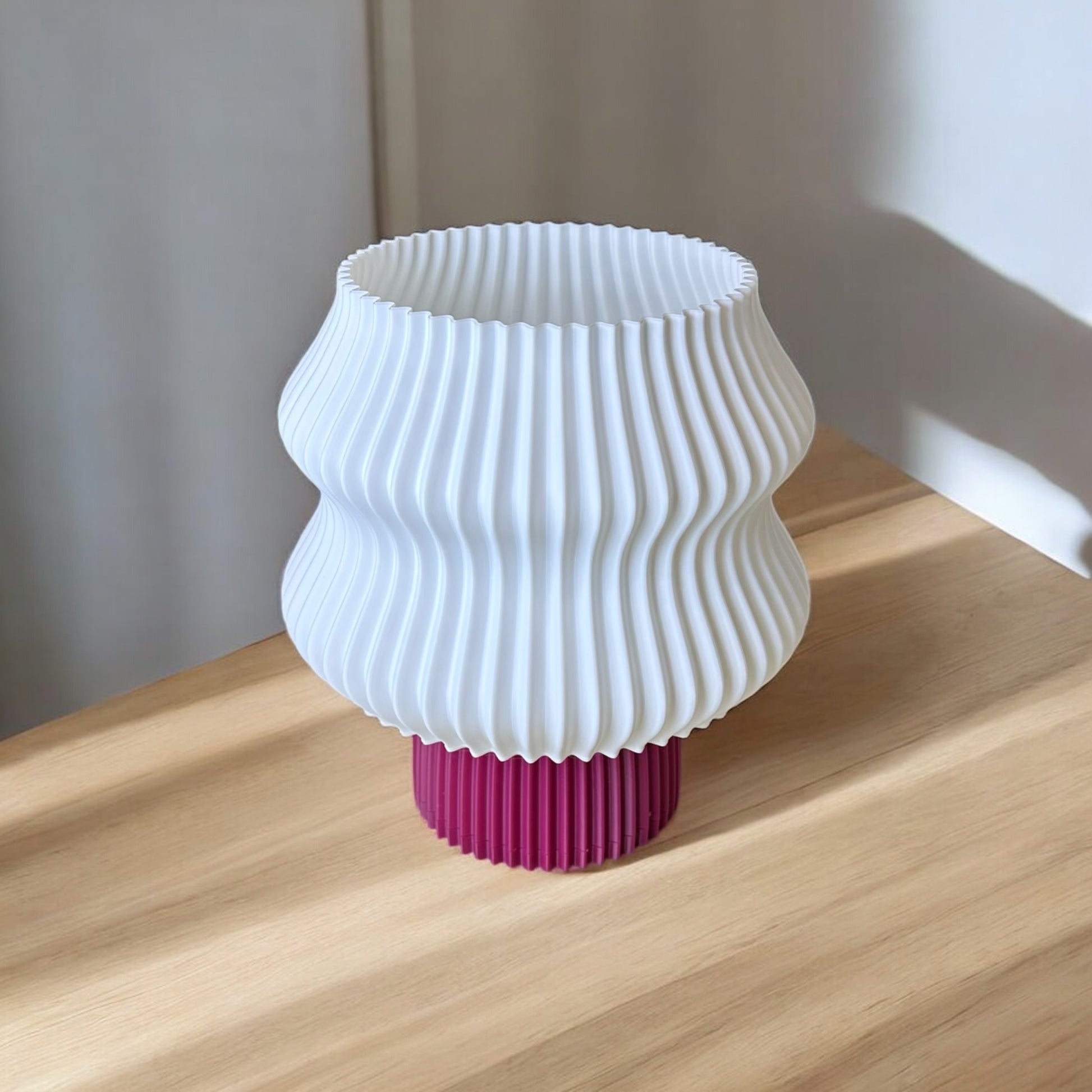 Kabuk Factory olarak tasarlayıp ürettiğimiz bu dalga formlu masa lambası, zarif beyaz abajur kısmı ve canlı pembe tabanı ile dekorasyonunuza enerji katar.